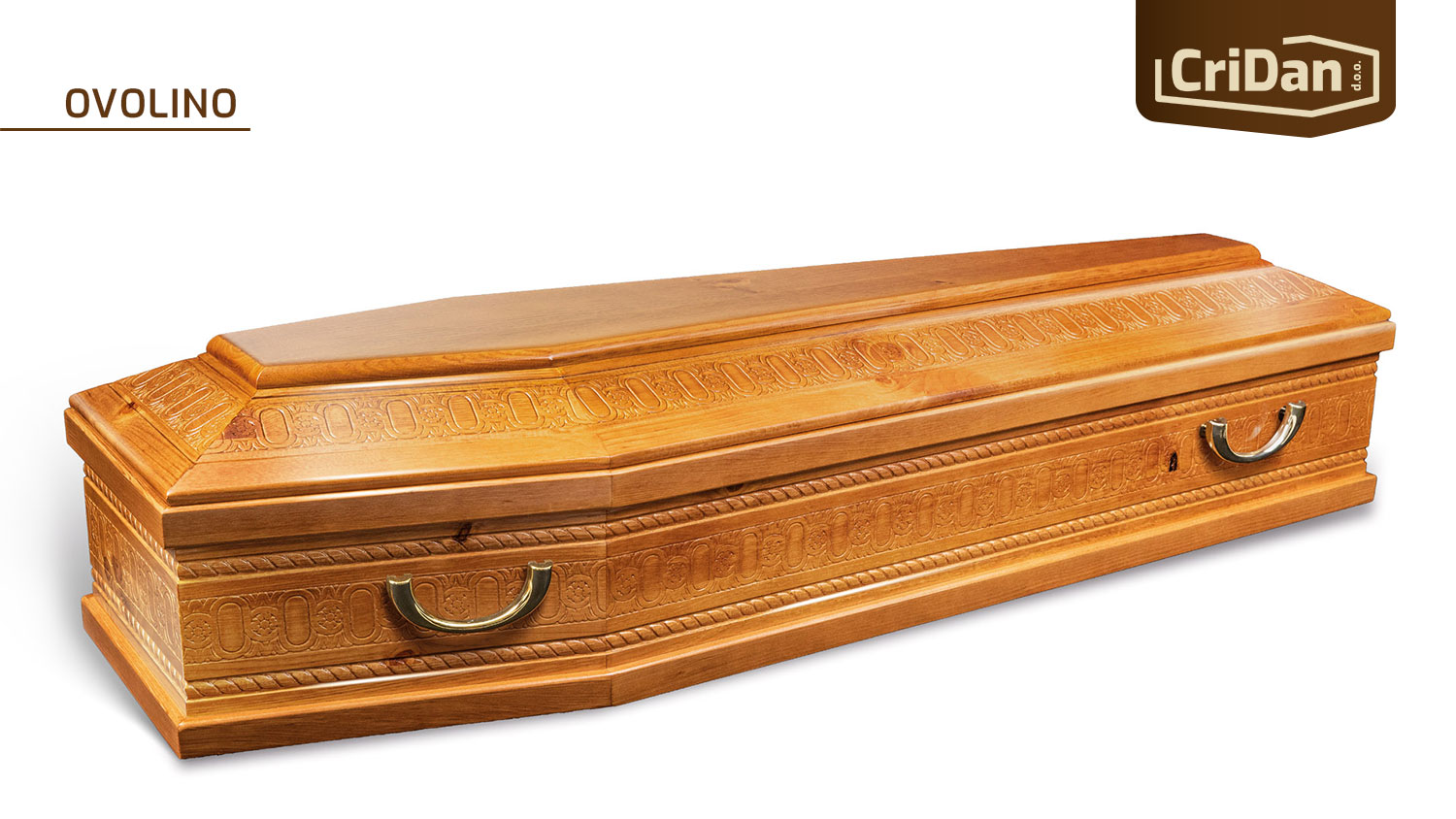 Hexagonal pine coffin for burial or cremation and burial in a grave, with geometric motifs on the sides and lid made using the pressing technique.