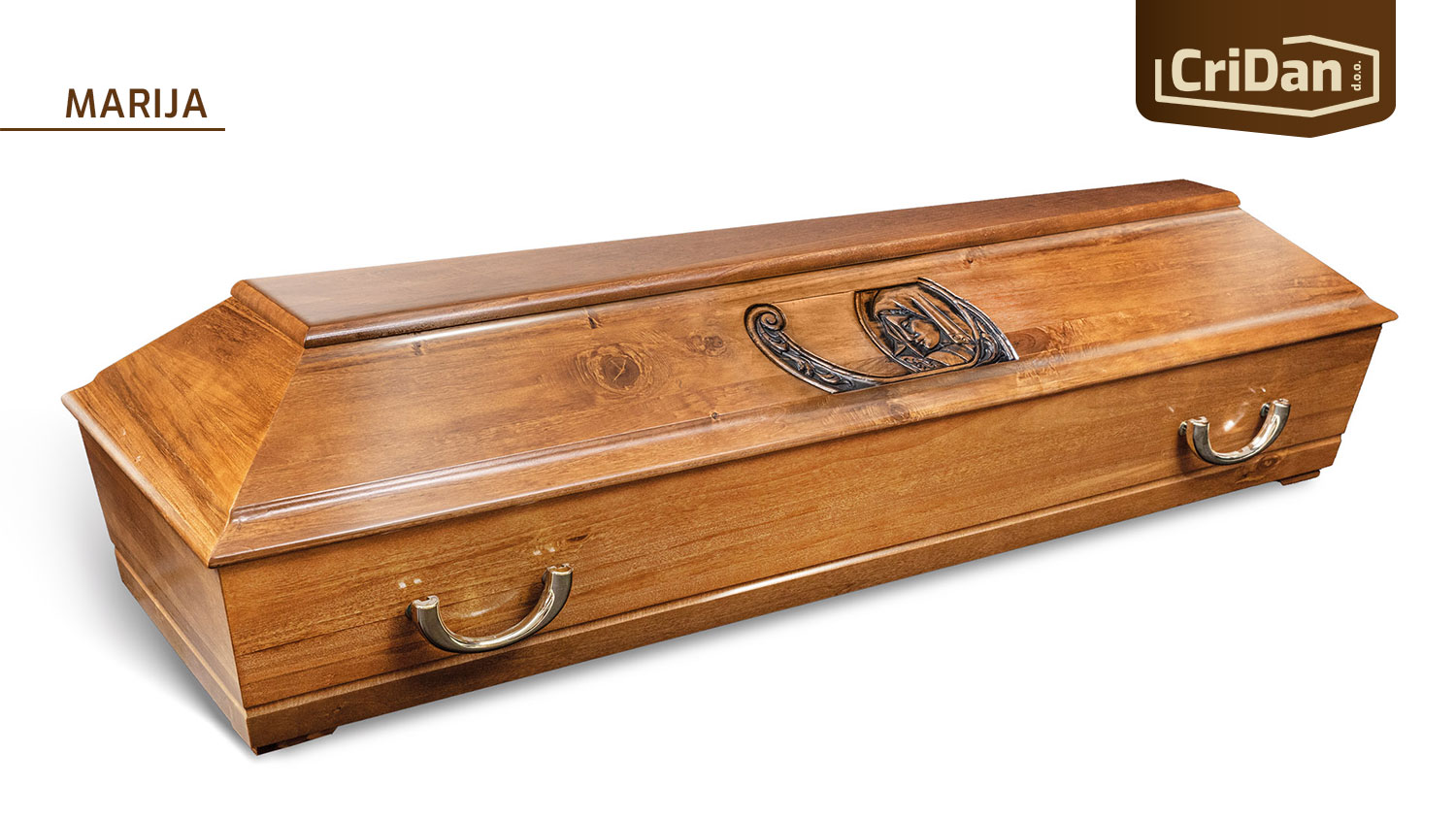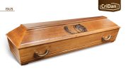 Bara standard in legno di pioppo per sepoltura o cremazione e successiva inumazione in tomba, con immagine della Vergine Maria sul coperchio realizzata mediante la tecnica della pressatura.